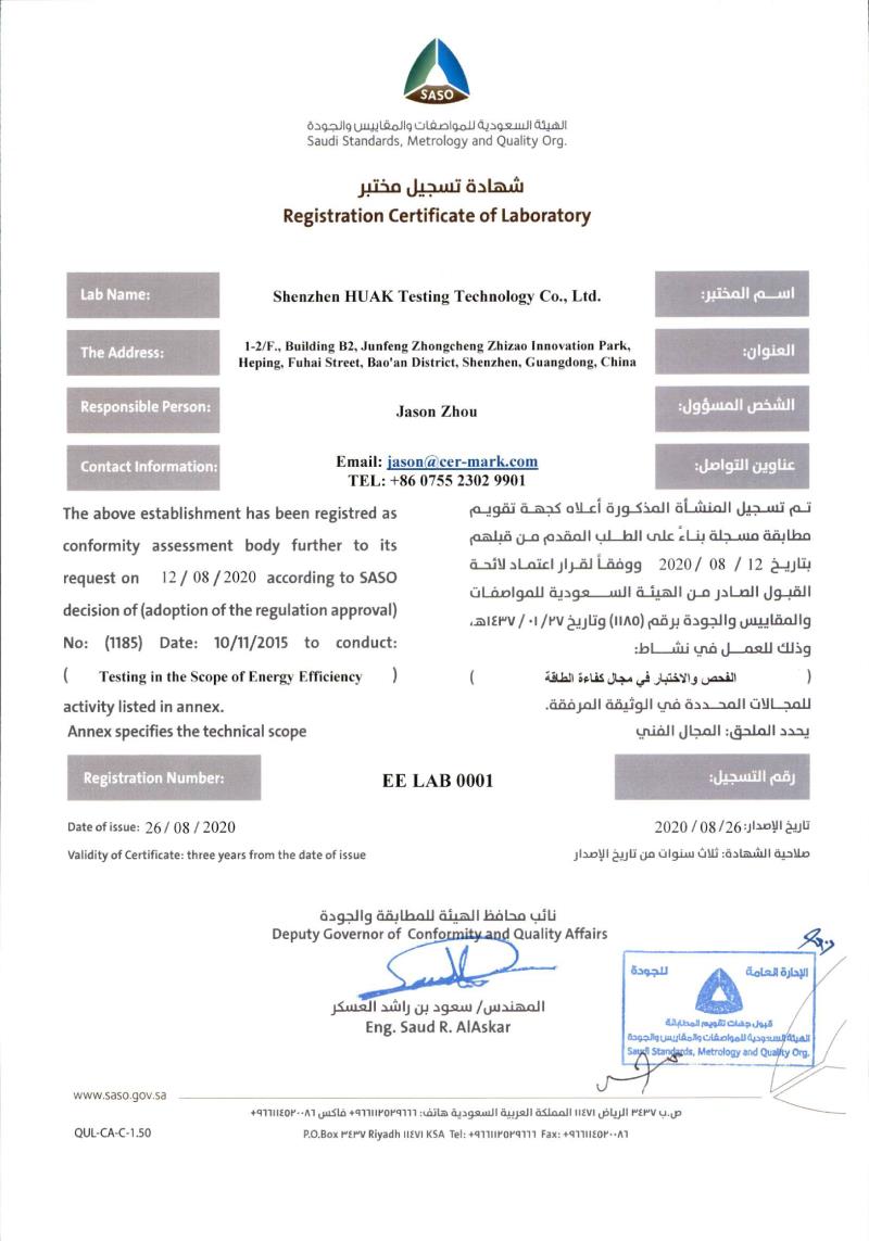 SASO Authorized (KEX) Registration Certificate of Laboratory